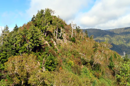 桧やシャクナゲ等の木の根や岩をよじ登る感じで行くが、直径70-80cmのツガの倒木がまともに路をふさいで、脇の斜面や狭い隙間を潜ったりしなければならないところが何箇所かあって苦労した。