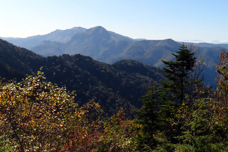 急坂を登り切った針葉樹に囲まれたスペースを物思平と言うらしいが、思わせぶりの名前だ。さらにずっと林の中を行くがまだ展望は開けない。やがて現れる尖ったピークがワルサ峰(1870m)だ。ここからは展望も開けて北に苗場山の山頂の湿原が黄色に染まっていた。そしてそこから右へ目を向けていくと赤倉山そして佐武流山に向かっていくつものピークが連なっている。長い稜線だ。手前の深い谷は西赤沢だ。